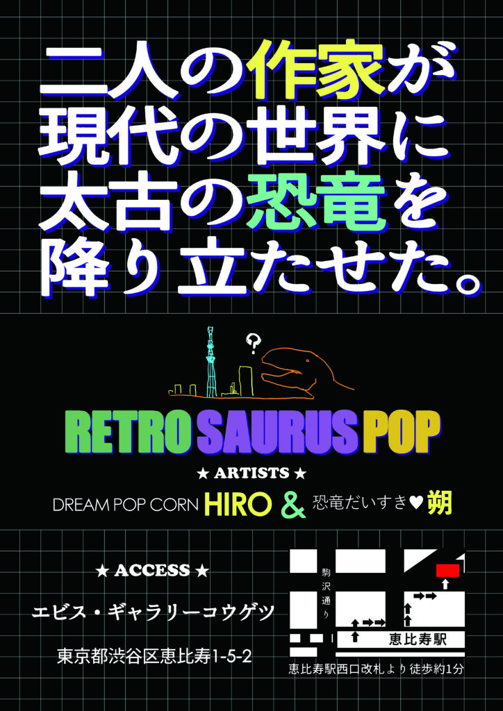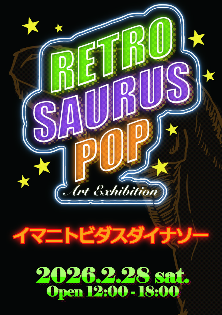 レトロザウルスポップ展のご案内 お知らせ Twitter Facebook はてブ Pocket LINE コピー 2026.01.19 2026.01.18 ドリームポップコーンのヒロと恐竜大好き朔さんとの共同展、レトロザウルスポップ展を開催致します。 現代の世界に「太古の恐竜」を降り立たせるアートエキシビションRETRO SAURUS POP展示会場は、思わず笑顔になる気持ちが前を向くそんな“パワースポット”。恐竜が好きな人もアートが好きな人もつくる人も、届ける人も。この空間で、何かが始まるかもしれない。 開催日 2月28日(土) 場所 東京都渋谷区恵比寿 入退場自由 無料展覧会 詳細はフライヤーをご覧ください。↙